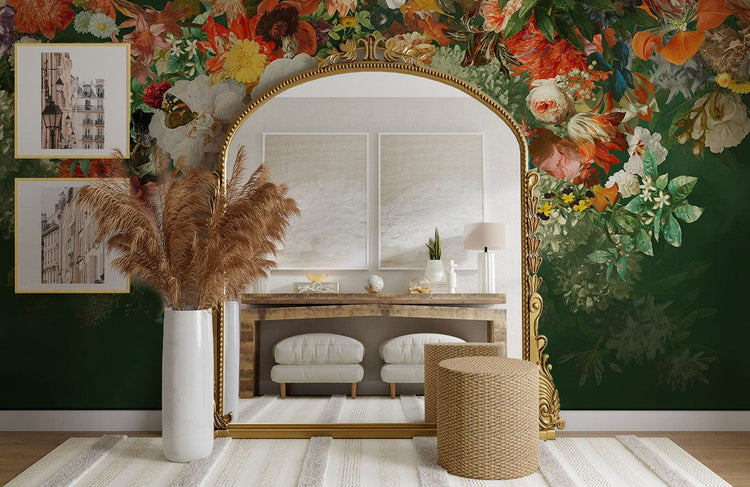 Papier peint mural fleurs vives et miroir doré pour une nature artistique