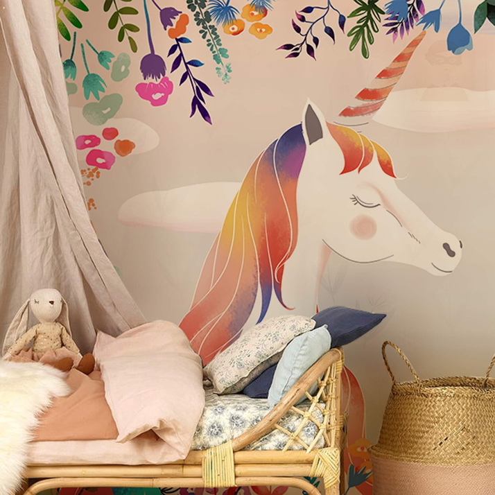 | Papiers peints licornes multicolores | Effet arc-en-ciel, motifs animaliers stylisés | Espace créatif ou salle de jeu |