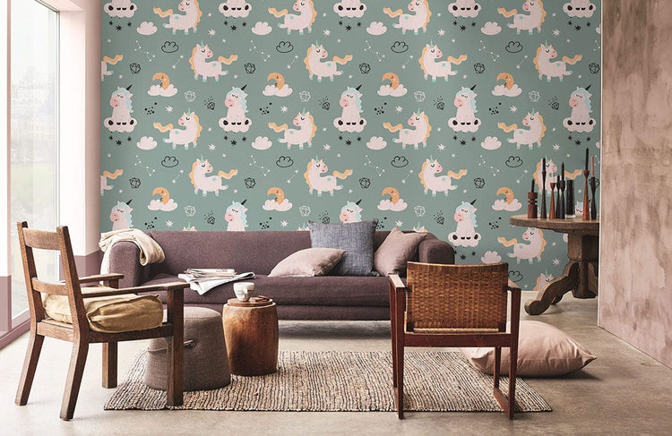 Papier peint mural rêve avec licornes, nuages et étoiles sur fond teal pour décoration murale