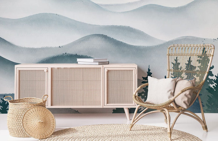 Peint mural montagne d’encre avec paysage brumeux et arbres verts pour décoration intérieure