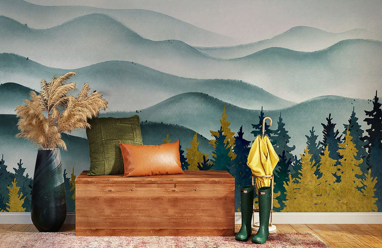 Peinture murale montagne ombre avec forêts vertes et montagnes brumeuses en papier peint mural