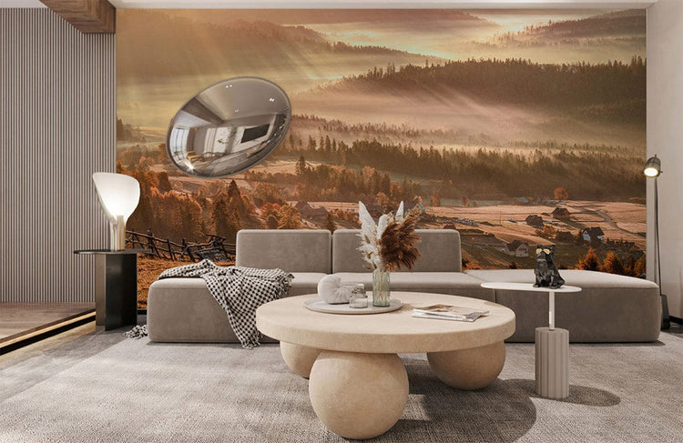 Papier peint mural montagne automnale avec vallée brumeuse et maisons au lever du soleil
