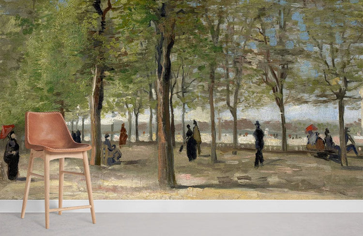 Peinture d un parc arboré avec des promeneurs, idéal pour votre papier peint panoramique sur mesure