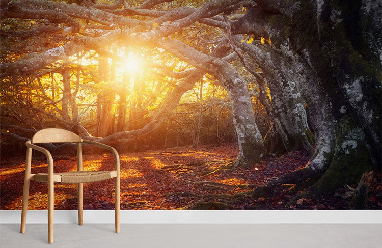 Papier peint mural forêt du Centenaire avec chemin ensoleillé, arbres anciens et feuilles d’automne