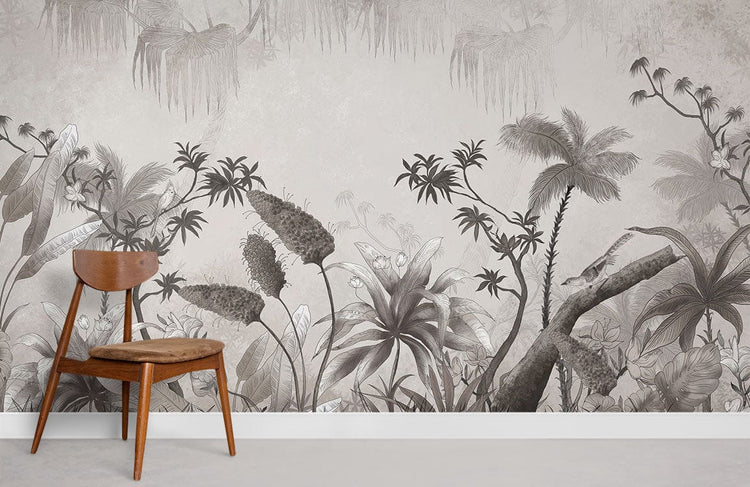 Papier peint mural de nature sauvage avec scène de jungle tropicale monochrome luxuriant