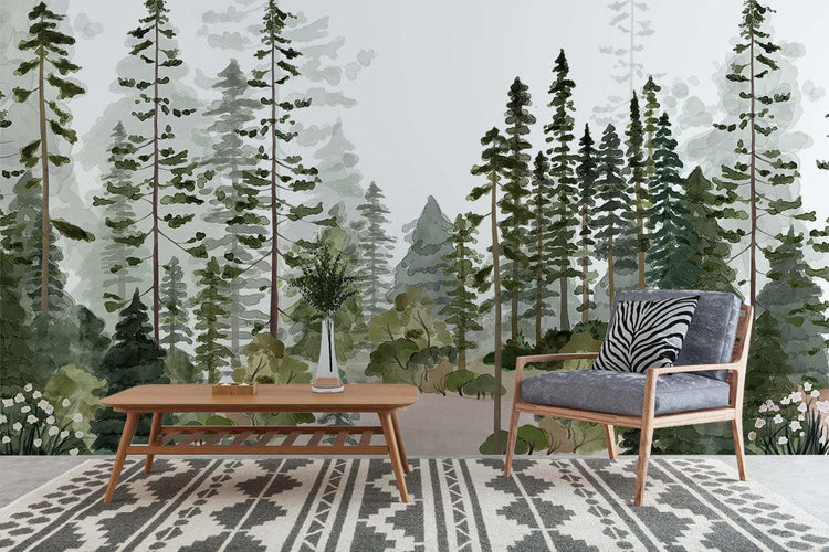 Papier peint mural forêt aquarelle dans un salon beige avec une peinture murale forêt
