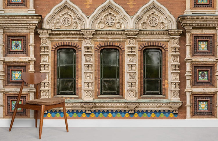 Papier peint mural darchitecture baroque avec façade décorée et trois fenêtres en arche
