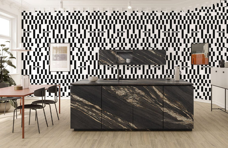 Papier peint moderne Bauhaus géométrique noir et blanc dans une cuisine contemporaine