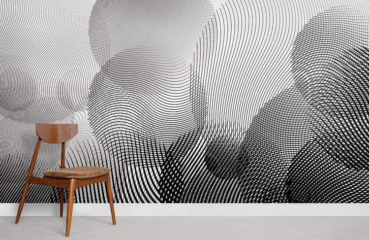 Murale cercles noirs ombrés avec chaise en bois, peinture mural cercles pour déco moderne