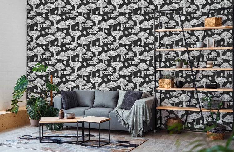 Papier peint mural de champignons noirs avec motif blanc pour décoration murale élégante