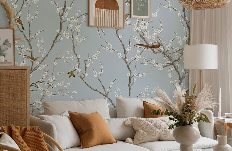 Fresque murale prunier blanc avec cerisiers en fleurs et petits oiseaux sur fond bleu gris