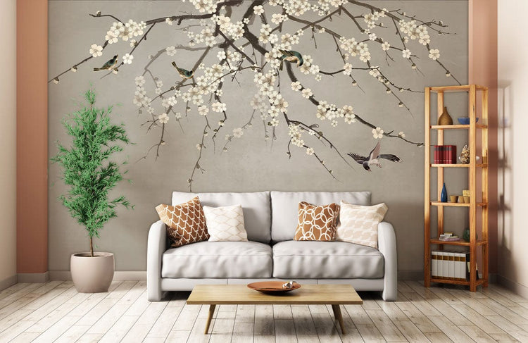 Papier peint mural de branches à l’encre de Chine avec cerisiers et oiseaux dans salle à manger