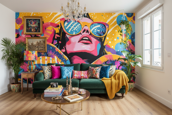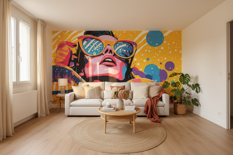 Papier peint panoramique sur mesure Éclats Pop Festifs Saisons avec femme stylisée en lunettes roses et bleues, motifs vibrants jaunes, oranges, violets et noirs
