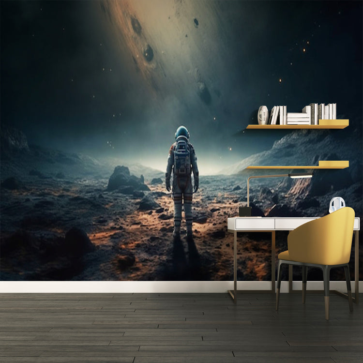 Papier peint voie lactée avec astronaute sur une planète extraterrestre dans une pièce