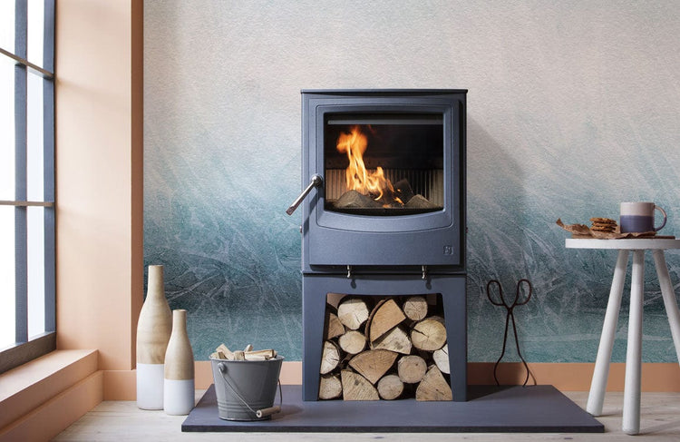 Stove à bois gris foncé avec porte en verre et logs sous papier peint motif abstrait