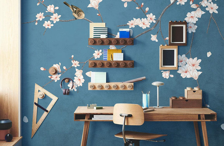 Image d’une chambre avec un lit bleu et un mur mural floraison paisible en papier peint
