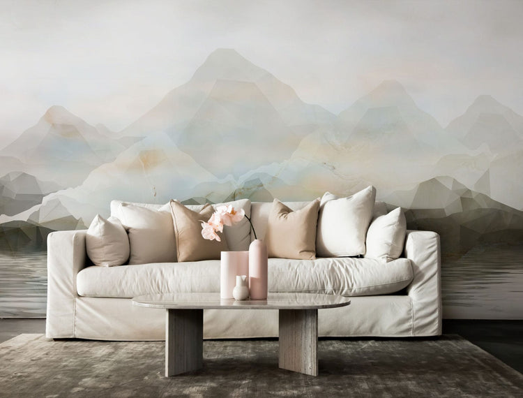 Murale de Papier Peint Montagnes de Cristal dans un salon moderne avec canapé gris clair
