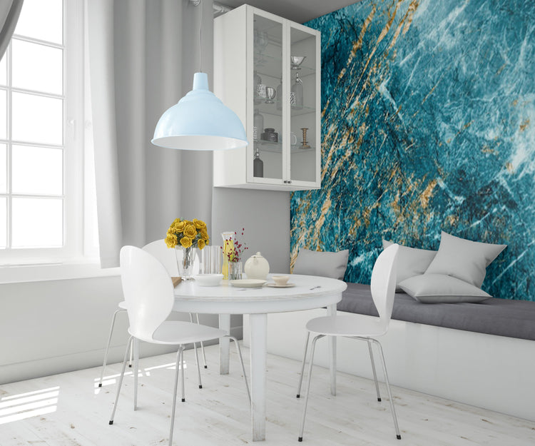 Revêtements Muraux Nobles : Éclat d'Azur & Éclats Dorés – Tapisserie Haut de Gamme Texturisée Immergez-vous dans l'univers du raffinement avec notre sélection exclusive de tapisserie haut de gamme arborant des veinures précieuses bleutées et des reflets aurifères.