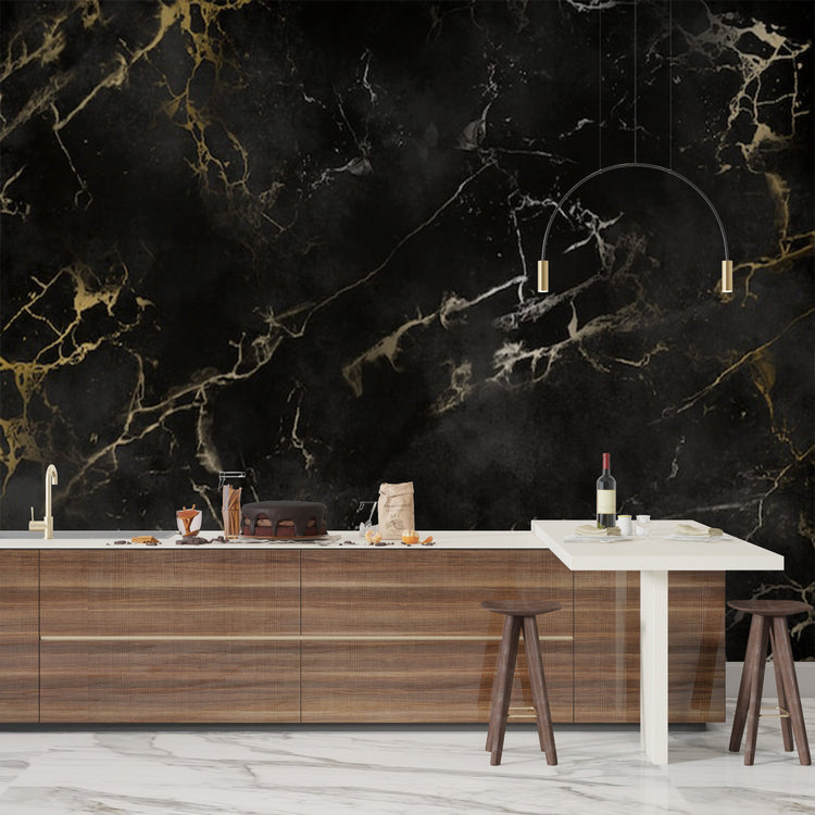 Revêtement Mural Effet Marbré – Splendeur Opulente en Nuances D'Ébène et d'Aurum Plongez dans un univers de raffinement avec notre sélection exclusive de tapisseries imitant parfaitement le marbre dans ses plus beaux atours noirs striés de filaments dorés.