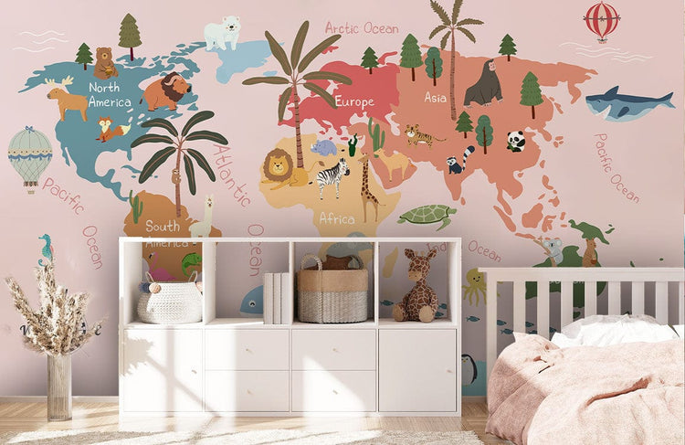 Papier peint mural à motif d’animaux roses dans une chambre d’enfants avec carte du monde
