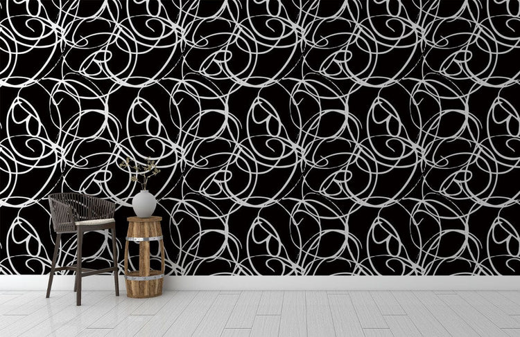 Papier peint mural à motif floral élégant avec lignes tourbillonnantes blanches sur fond noir