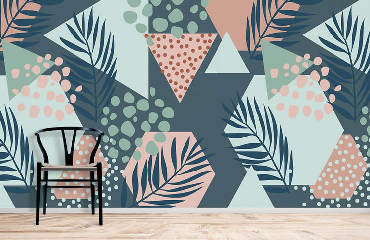 Papier peint mural à motifs de feuilles et de pois avec formes géométriques en teal, rose, menthe