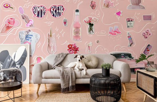 Collage d’objets et mode rose pour papier peint mural autocollant tendance