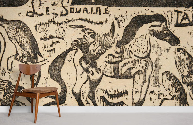 Peint mural cheval avec animaux et figures en style boiscut pour papier peint mural