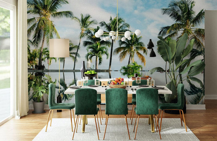 Peint mural cocotiers dans salle à manger avec chaises vertes en papier peint mural Cocotiers d’Oceanside