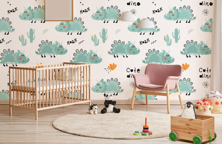 Photo d’un papier peint mural avec des dinosaures verts, cactus et texte Cute dino