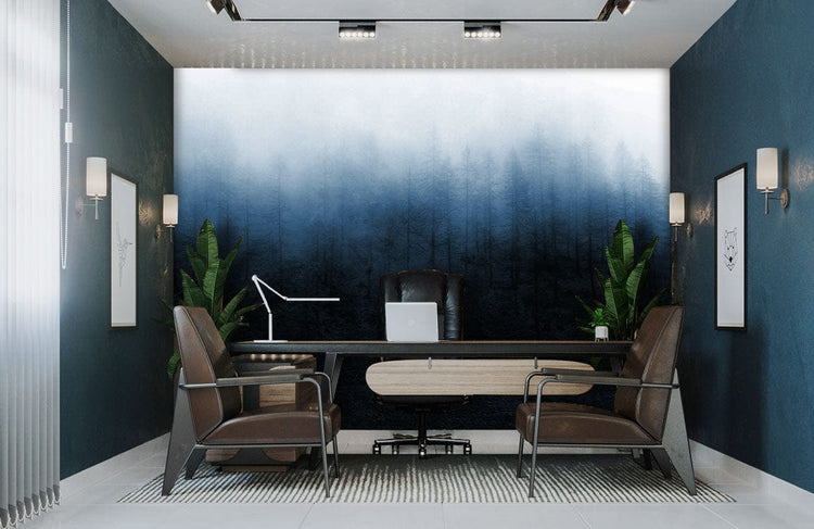 Papier peint mural de la forêt de pins brumeuse dans un bureau moderne avec mur bleu foncé