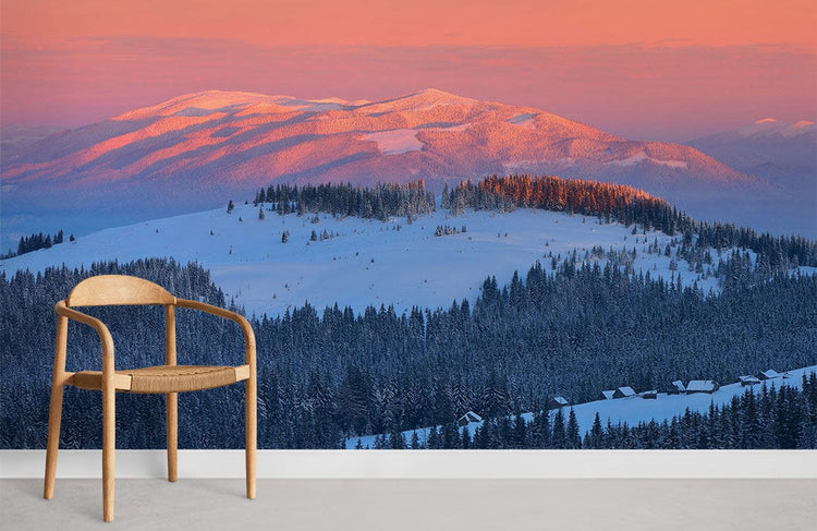 Papier peint mural de montagne enneigée et onirique dans un salon moderne