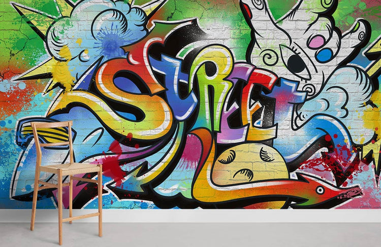 Papier peint mural graffiti arc-en-ciel éclat urbain et personnages cartoon
