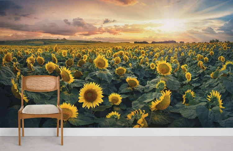 Papier peint mural de tournesol avec champ vibrant sous coucher de soleil coloré