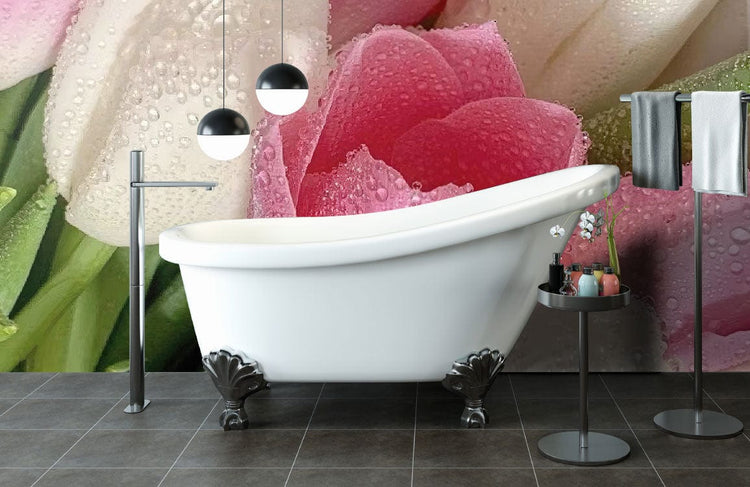 Papier peint mural de tulipes fraîches avec tulipes roses et blanches et dewdrops