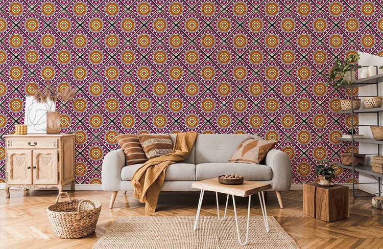 Papier peint mural avec motif floral mandala violet et orange, fleurs rouges