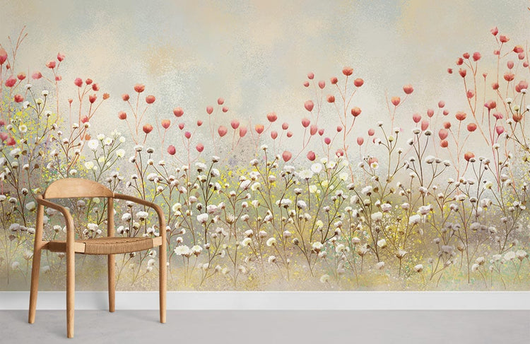 Peinture murale fleurs de printemps avec champs de fleurs blanches et roses