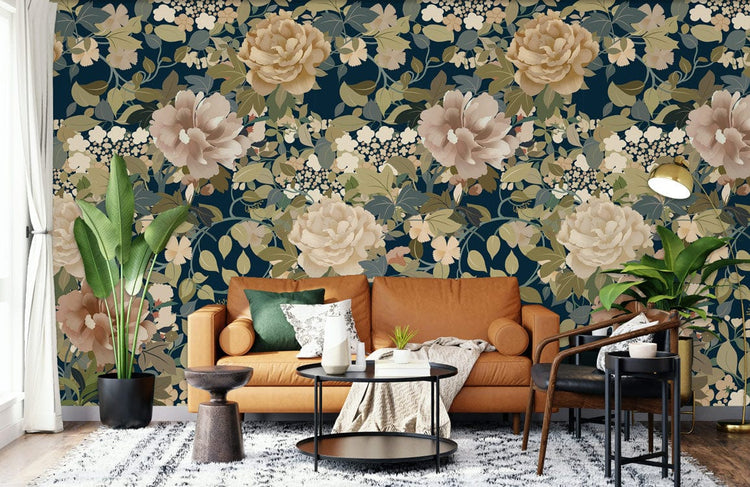 Papier peint mural fleurs avec fleurs dorées et fond floral foncé pour décoration élégante