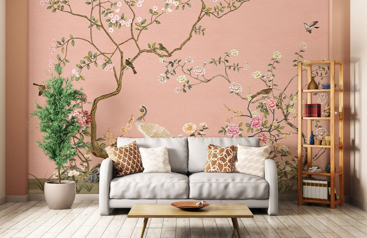 Papier peint mural fleurs avec oiseaux, fleurs et grue dans style Chinoiserie