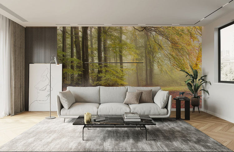 Image d’un salon moderne avec papier peint mural forêt en automne et mobilier contemporain