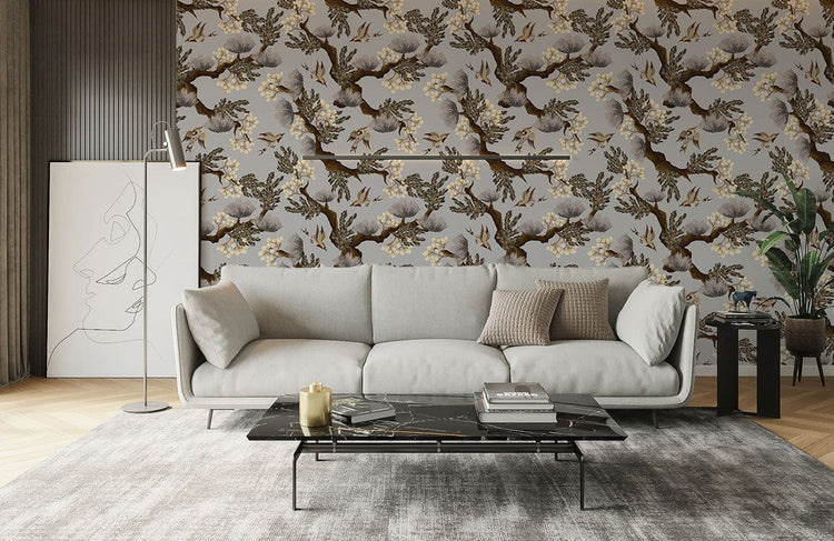 Papier peint mural gris avec fleurs et oiseaux dans un salon moderne avec canapé gris
