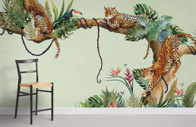 Mural jungle avec léopards et toucan, parfait pour votre papier peint mural jungle