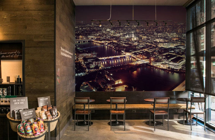 Intérieur d’un café avec mural Londres de nuit, parfait pour un peint mural Londres