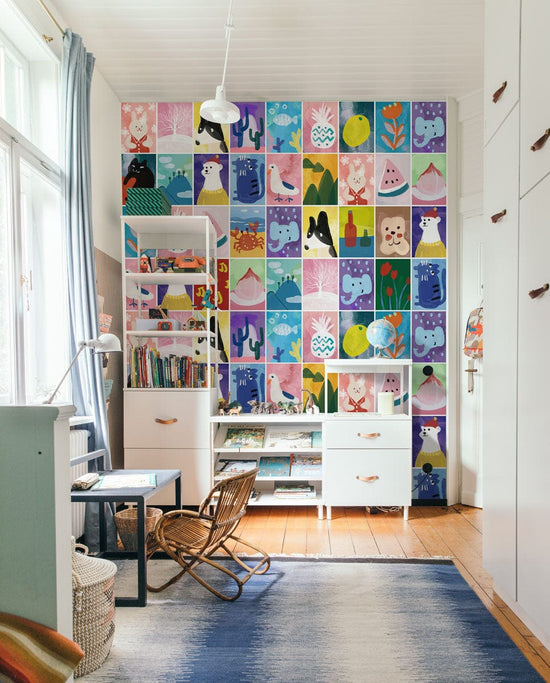 Papier peint mural coloré avec animaux, plantes et objets illustrés, design mignon et abstrait