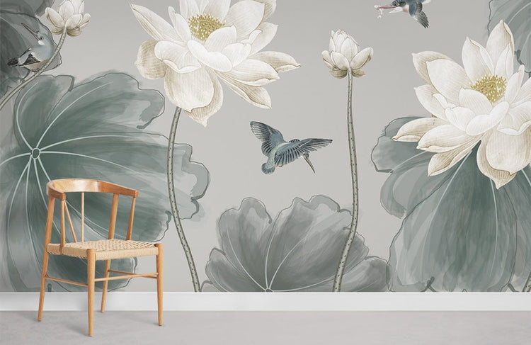 Papier Peint Mural Oiseaux & Lotus