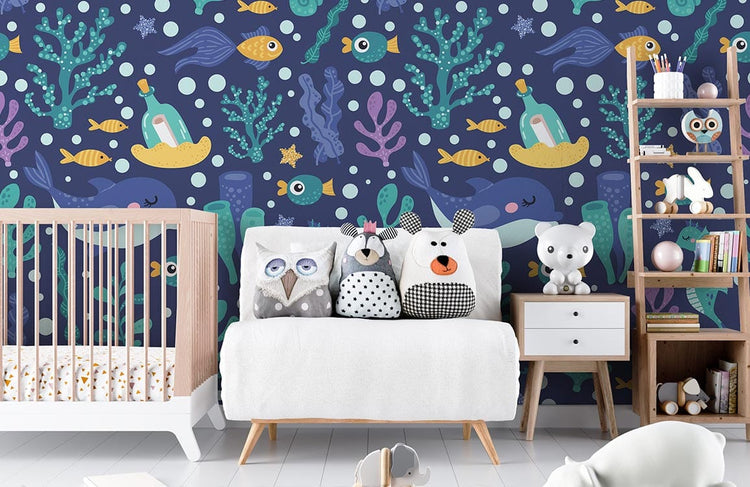 Papier peint mural poisson et bulles avec motifs de créatures marines sur fond bleu foncé