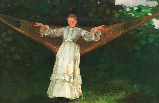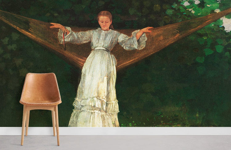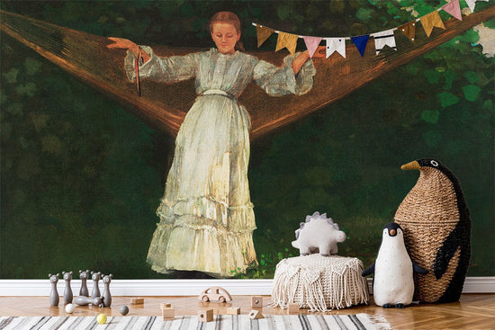 Femme en robe claire devant un hamac avec papier peint mural pour un après-midi d’été