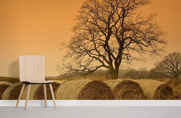 Peint mural prairie d’automne avec paysage rustique, bottes de foin et arbre nu
