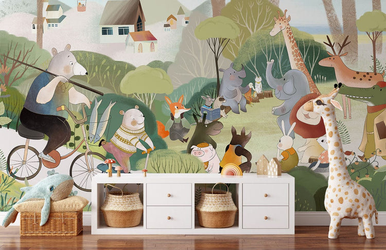 Murale rassemblement d’animaux dans une chambre d’enfants avec forêt et village féeriques