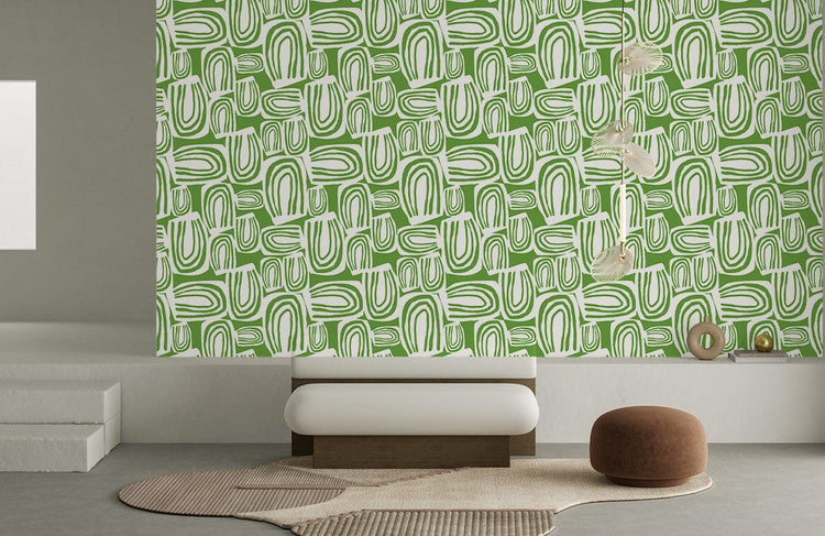 Papier peint mural vert avec motif géométrique abstrait et formes organiques blanches